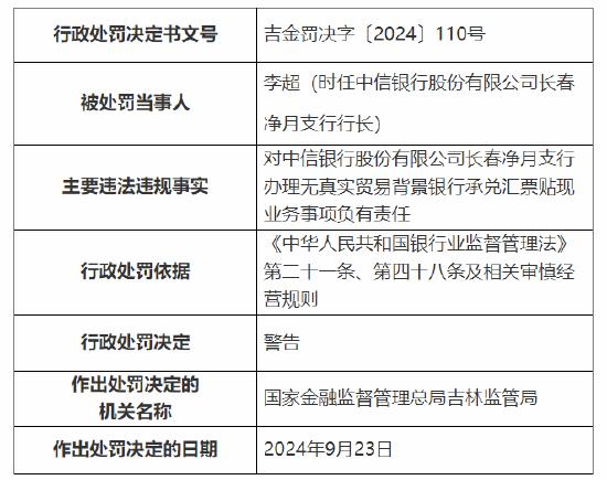 李超(时任中信银行股份有限公司长春净月支行行长)负责中信银行股份有限公司长春净月支行办理无真实贸易背景银行承兑汇票贴现业务,并受到监管警告;