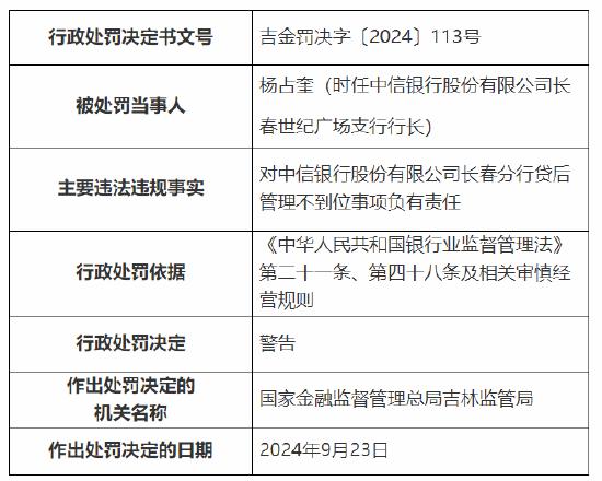 杨占奎(时任中信银行股份有限公司长春世纪广场支行行长)负责中信银行股份有限公司长春支行信贷管理不到位,被监管警告。