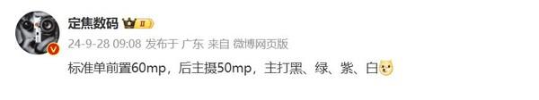 【CNMO 近日,根据博主的说法,科技新闻 @定焦数码 爆料,华为 nova 13 外置系列专业版 60mp 单摄像头,后主摄像头 50mp,主要推广黑色、绿色、紫色、白色。