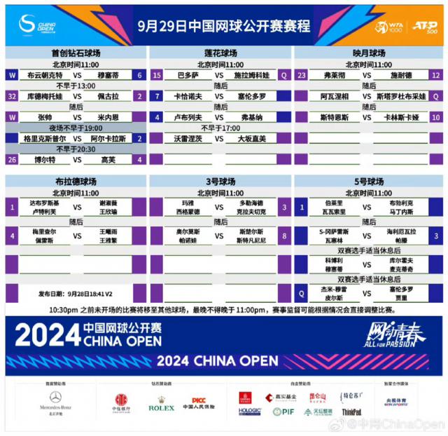 9 月 29 中国网球公开赛第一天, 7 一个比赛日继续在北京多个场馆举行,张帅、王曦雨、王雅繁、王欣瑜 4 在今天的单打、双打比赛中,朵金花将向下一轮发起冲击。