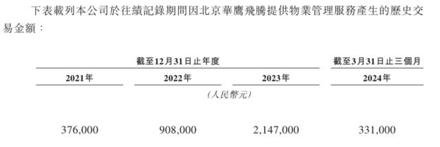 北京华鹰飞腾除出租屋外,还为赤峰黄金提供物业服务。2021 年 -2023 2008年,双方物业费的交易额分别为 37.6 万元、90.8 万元、214.7 一万元,可见物业费迅速上涨。今年以前 3 本月,双方物业费交易金额为 33.1 万元。
