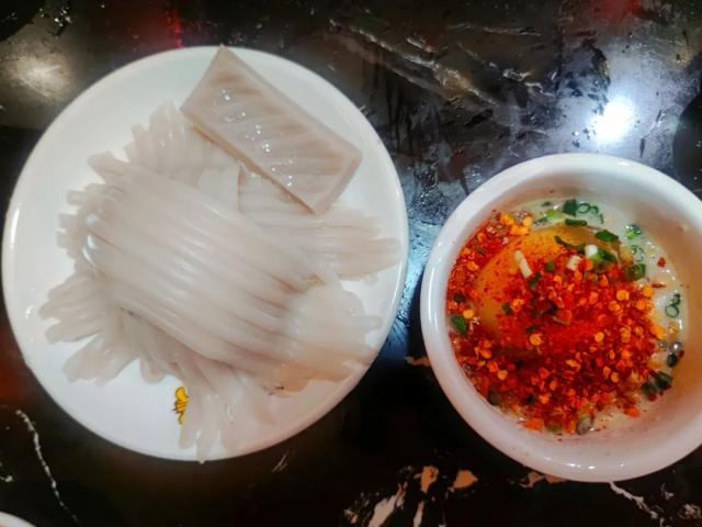 榕江卷粉:米皮配瘦肉、竹笋、干豆腐等食材,然后拌上酱油、豆腐卤水、酸醋,撒上姜蒜、辣椒粉,挺有味道的。
