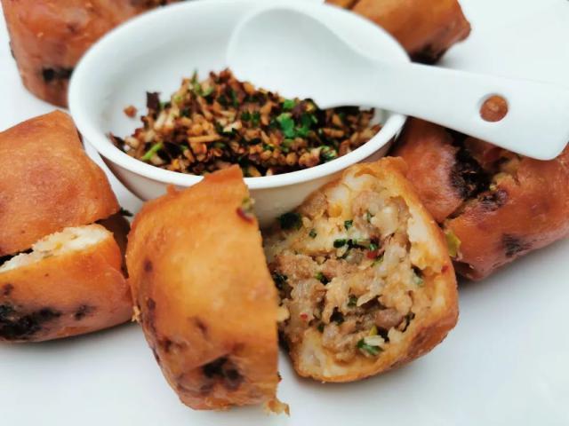 炸鸡蛋糕:以米饭和大豆磨浆为皮,以肉馅为核心,油炸而成。当地人吃的时候,拌上辣酱,折耳朵,香味舒适。 ~