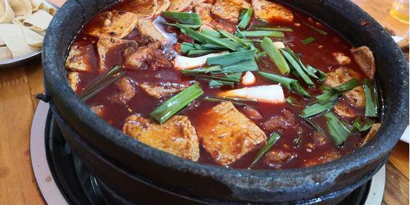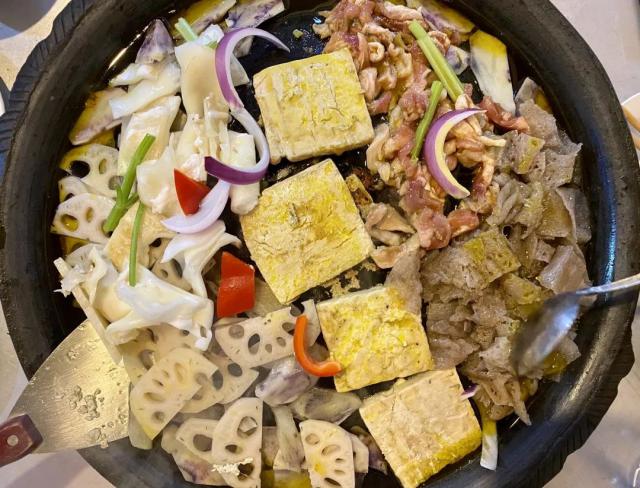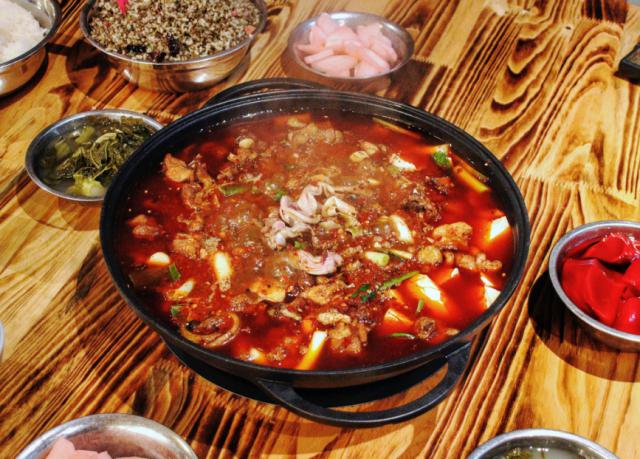 大方豆干鸡:在精心制作的锅底加入豆干,然后倒入鸡肉,汤色红油,麻辣可口,豆干吸饱了汤汁特别入味。
