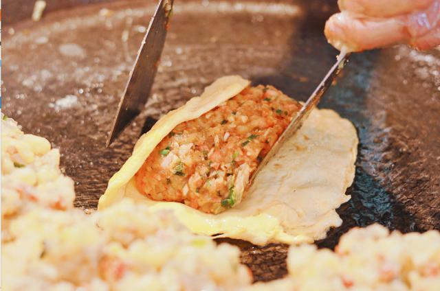 鸡蛋包土豆:煎蛋皮内有土豆泥、鱼腥草、香肠、小葱、辣椒油等。