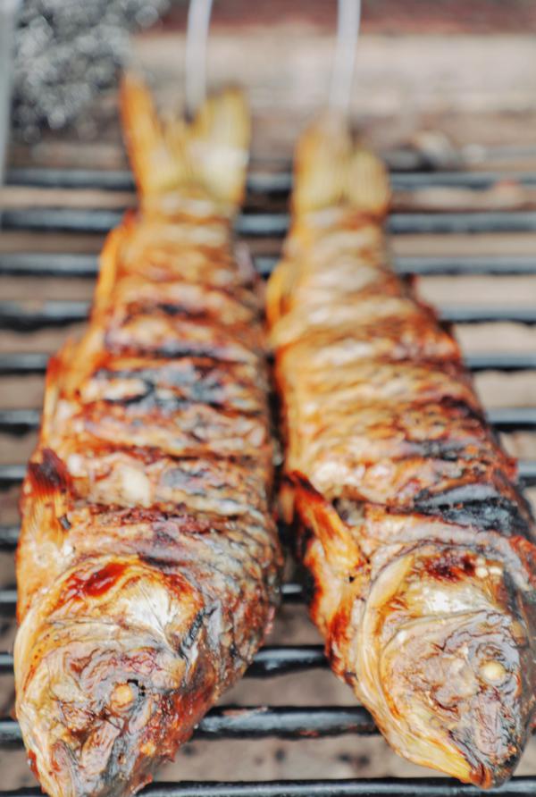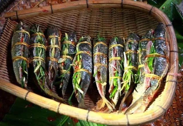 烤鱼:用香料包裹鱼,逐渐烤至金黄色,配以野韭菜、碎耳朵、大蒜、胡椒粉、胡椒粉等调味品食用。鲜嫩可口,风味独特,吃法非常纯天然!
