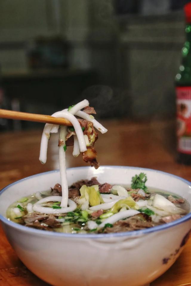 牛肉粉:米粉上铺着大块牛肉和泡菜,辣椒粉增添了风味。