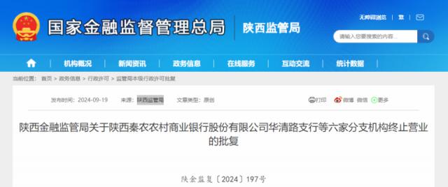 陕西秦农村商业银行6家分行停业