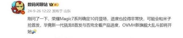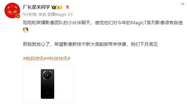 最近有数码博主爆料:刚和荣耀影像团队的小伙伴们聊天,感觉他们今年对于这一年 Magic7 系列图像表现非常自信。那我就放心了。我希望图像新技术和鞋底能带来惊喜。下个月底见。在此之前,我们只能基本确定。 Magic7 系列在 10 月份发布,现在范围又缩小到月底。