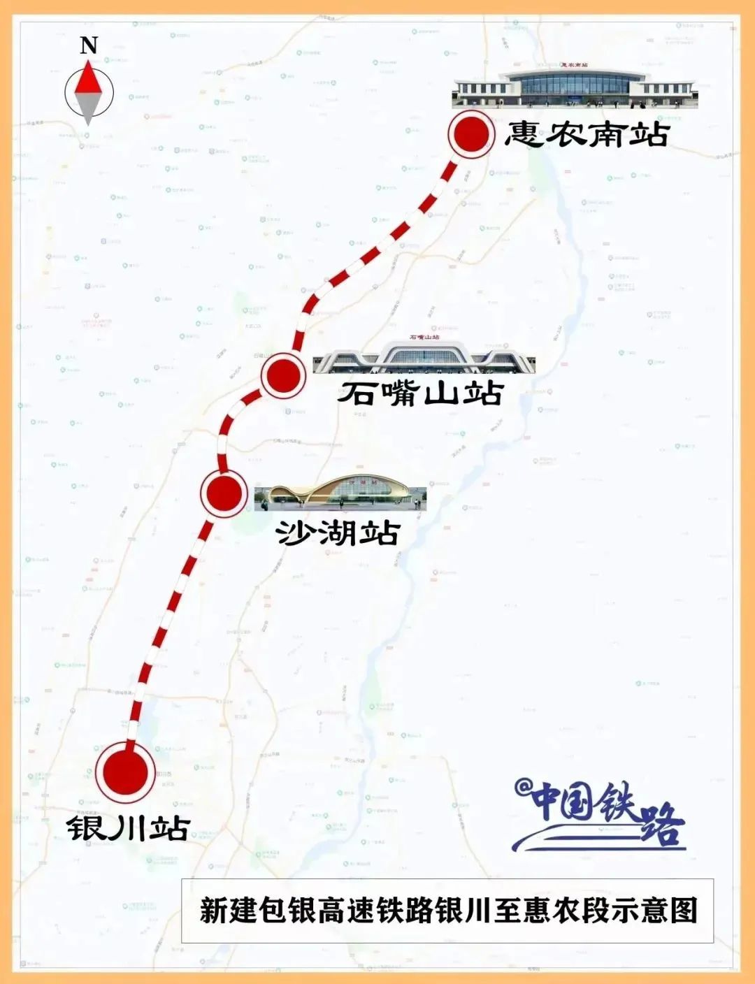 包银高铁起源于包头站,通过内蒙古自治区包头市、巴彦淖尔市、鄂尔多斯市、乌海市、宁夏回族自治区石嘴山市、银川市,连接银川站,正线总长约517公里,设计时速250公里。全线分段建设,包头至乌海至惠农段全长约420公里,于2022年4月开工,正在有序建设中;惠农至银川段总长度为97公里,于2019年10月开工,有惠农南、石嘴山、沙湖、银川四个车站,其中银川站为现有车站,其余为新建车站。