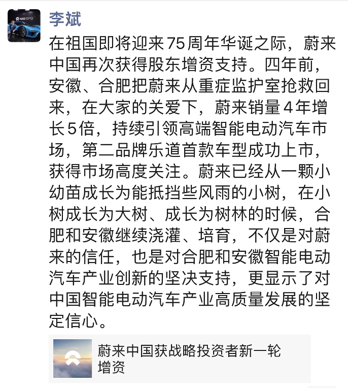 蔚来中国获得了33亿元的国有股东增资,李斌发文感谢安徽和合肥的支持。
