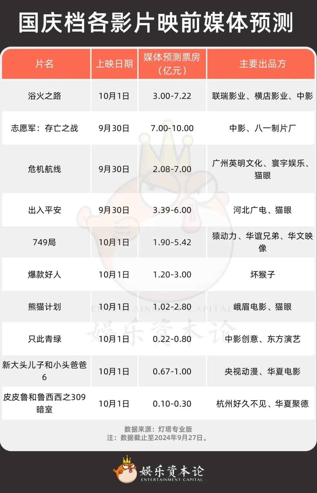 媒体预测,国庆档各电影上映前,注:数据截至2024年9月27日。