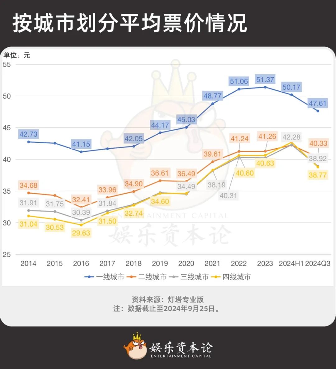 一线城市的票价走势一定是一个标志——作为电影消费的领导者,一线城市是电影传播的第一站,对电影市场的整体表现起着关键作用。过去一线城市和其他城市的票价差可以达到10元以上,但从目前的票价来看,二、三、四线城市还有降低票价的空间。