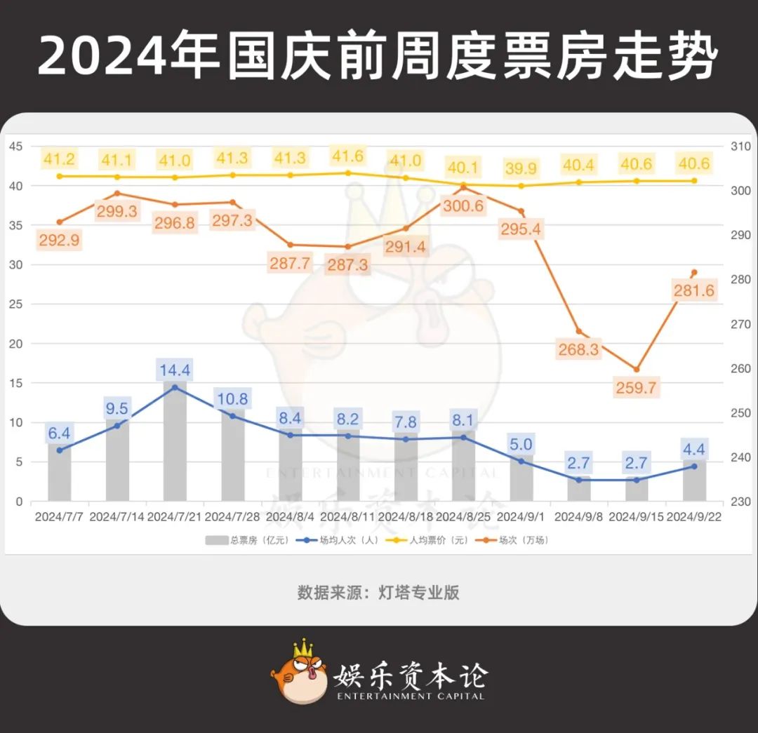 对比2023年和2024年国庆前的票房走势,不难看出:1)票价层面,与去年相比,今年的票价下降了1元左右,而且节前3周的平均票价保持不变(中秋3日的平均票价也是40.6元);