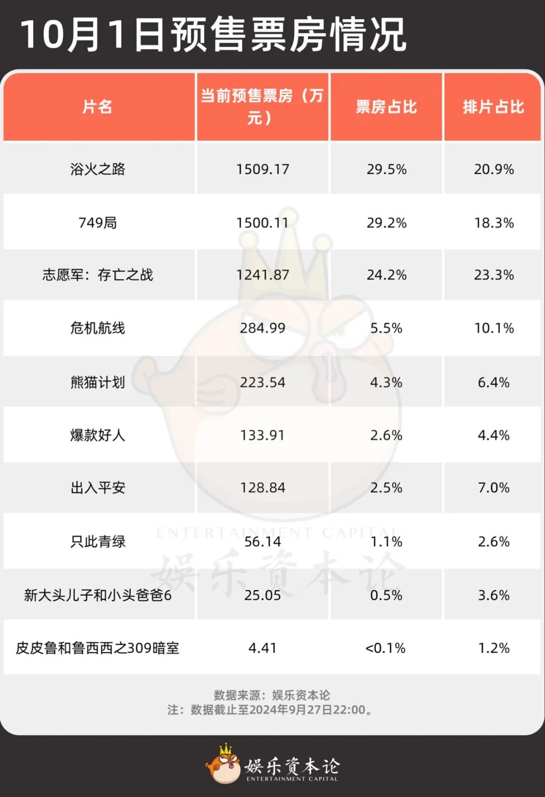 十月一日预售票房状况,注意:数据截止到2024年9月27日:00。