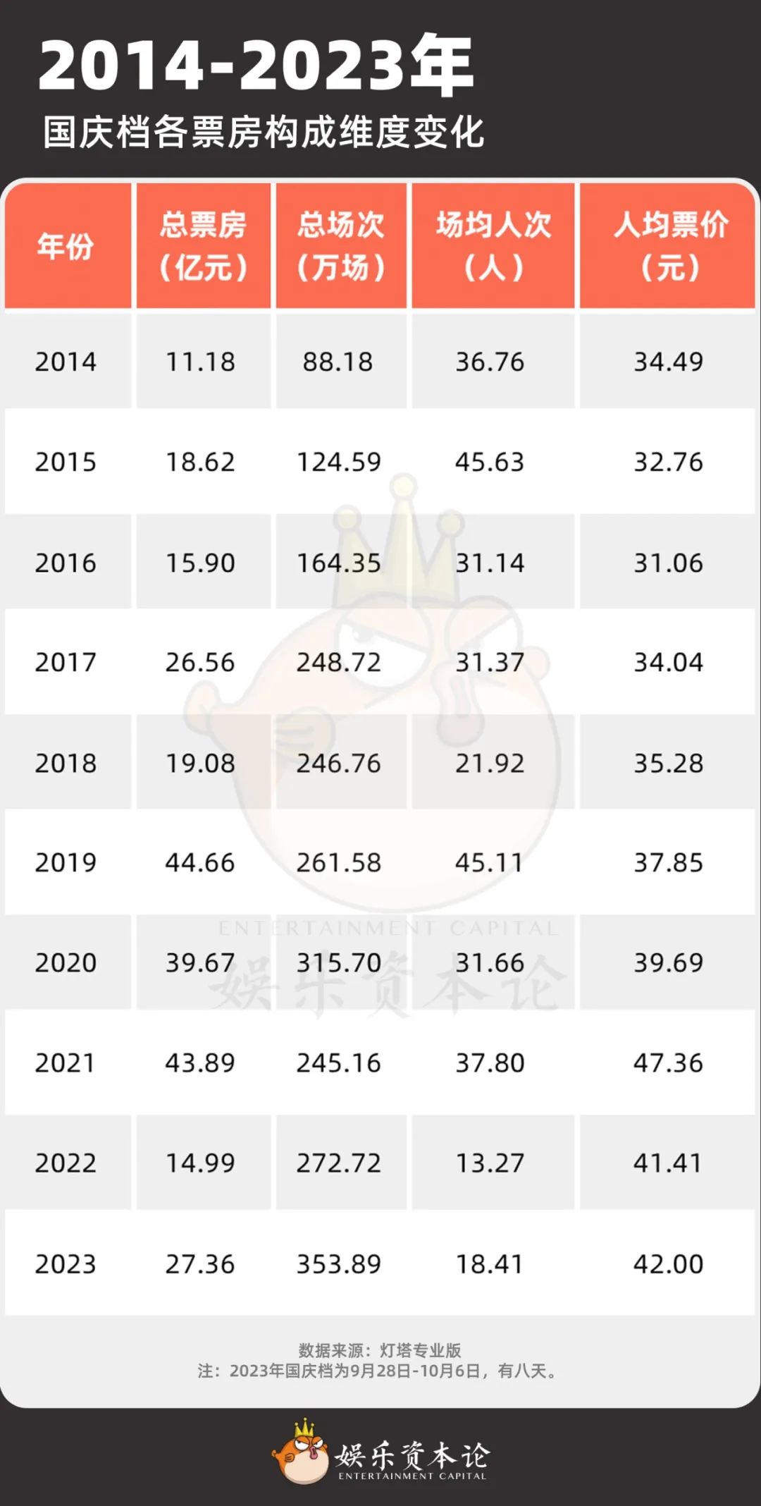 那国庆档的基本盘又有多少呢?从过去十年国庆档总票房的各个方面来看,2017年之前的总场次是制约票房增长的主要因素;2017-2021年,场均人数成为主要影响因素,人均票价持续上涨;从2022年开始,场均人数减半,票价有助于下降。