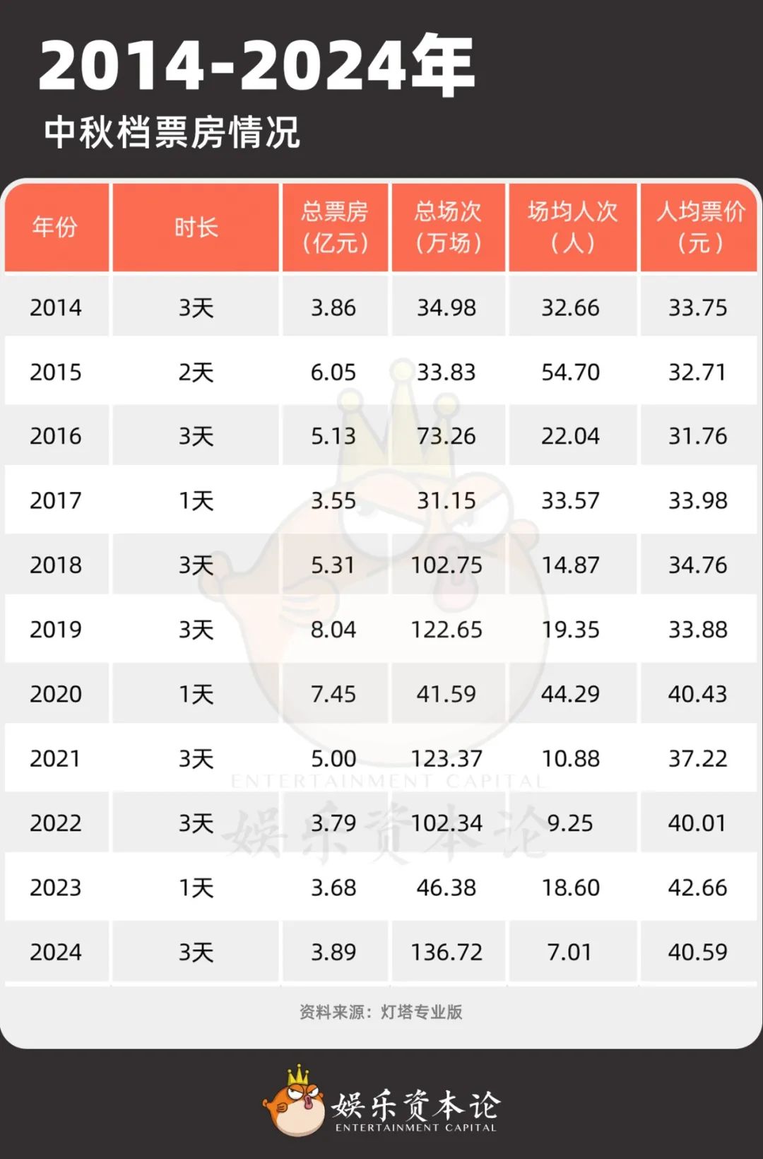 2014-2024中秋票房情况,信息来源:灯塔专业版。一样。