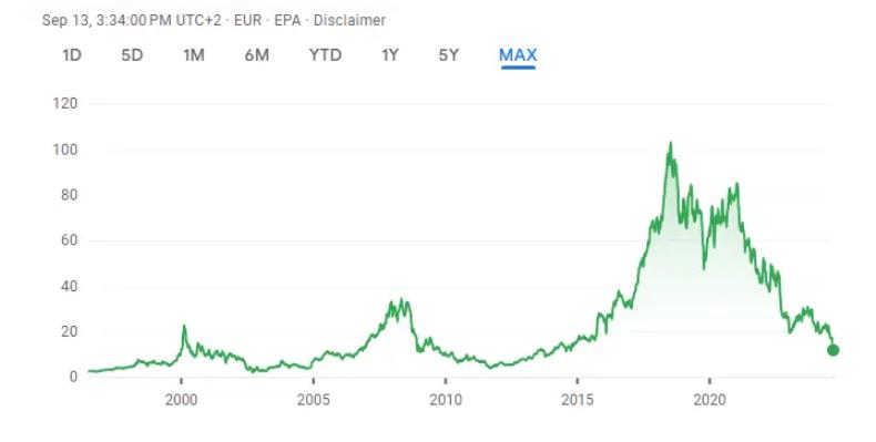 只要观察育碧的股价图,就能看到育碧在这些战斗中留下的痕迹。如果只回顾过去几年,你会注意到育碧的股价表现非常糟糕。在过去的一年里,公司的市值缩水了大约一半,从2020年开始,育碧的股价每年都表现不佳。