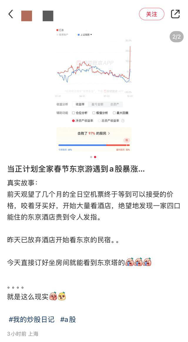 有意思的是,这个星期随之而来 A 随着股票的持续上涨,很多原本打算在国庆假期“蹲在家里”的投资者看到了机票酒店,很多原本打算“穷游”的投资者都提高了出行预算。有网友拍了升级截图说:“这几天, A 股票太争气了,自付给后天机票升级…”