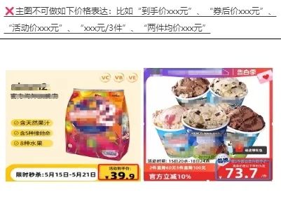 具体而言,商品主图应防止下列误导性价格表达,如“到手价xxx元”、“优惠券后价xxx元”、“活动价xxx元”、“xxx元/3件”、“两件均价xxx元”等。同时,平台鼓励并允许使用清晰、准确、不易混淆的价格和促销,如“礼品价值xx元”、“前x名送”、“可定制xx”、“300减20”、“第二件九折”、“第二件减9.9元”等。