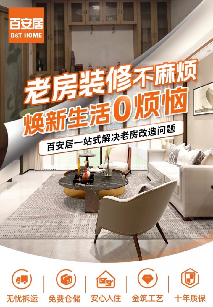 值得注意的是,为了帮助老房子的装修,百安居推出了“换新享受补贴,拆旧不花钱”的惠民服务,签约装修可享受15%的人工补贴。此外,还有很多福利,如免费仓储、安全拆卸、十年质保等。,为用户提供一站式老房改造和安心入住服务。