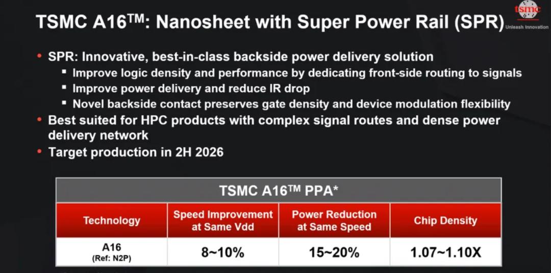 根据今年台积电发布会上公布的信息,TSMC A16TM技术将采用先进的纳米晶体管,与创新相结合背部电源轨道方案,计划于2026年投入生产。