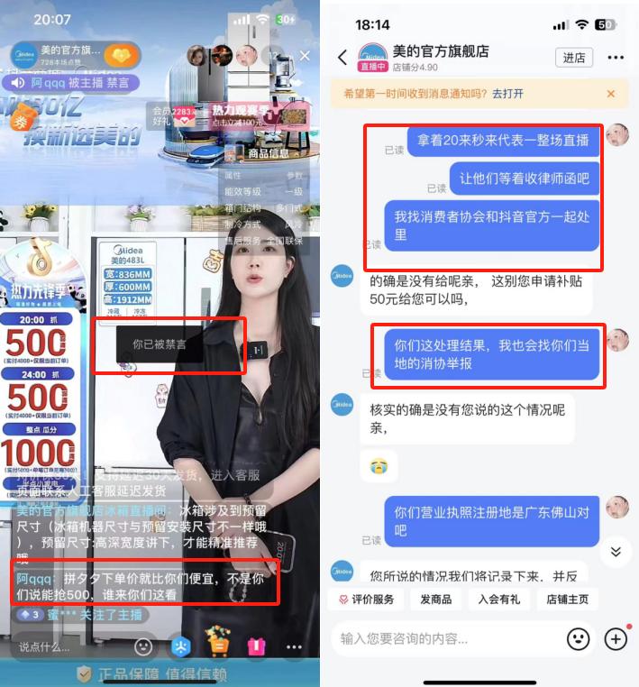 此外,长期蹲在“美的官方旗舰店”直播间的空调消费者告诉新浪科技,购买美的空调后,美的空调抽奖规则发生了变化,导致他们在购买前后有很大的期待。然而,在表达不满后,他们被主播直接禁止,他们的相关权益尚未完全实现。