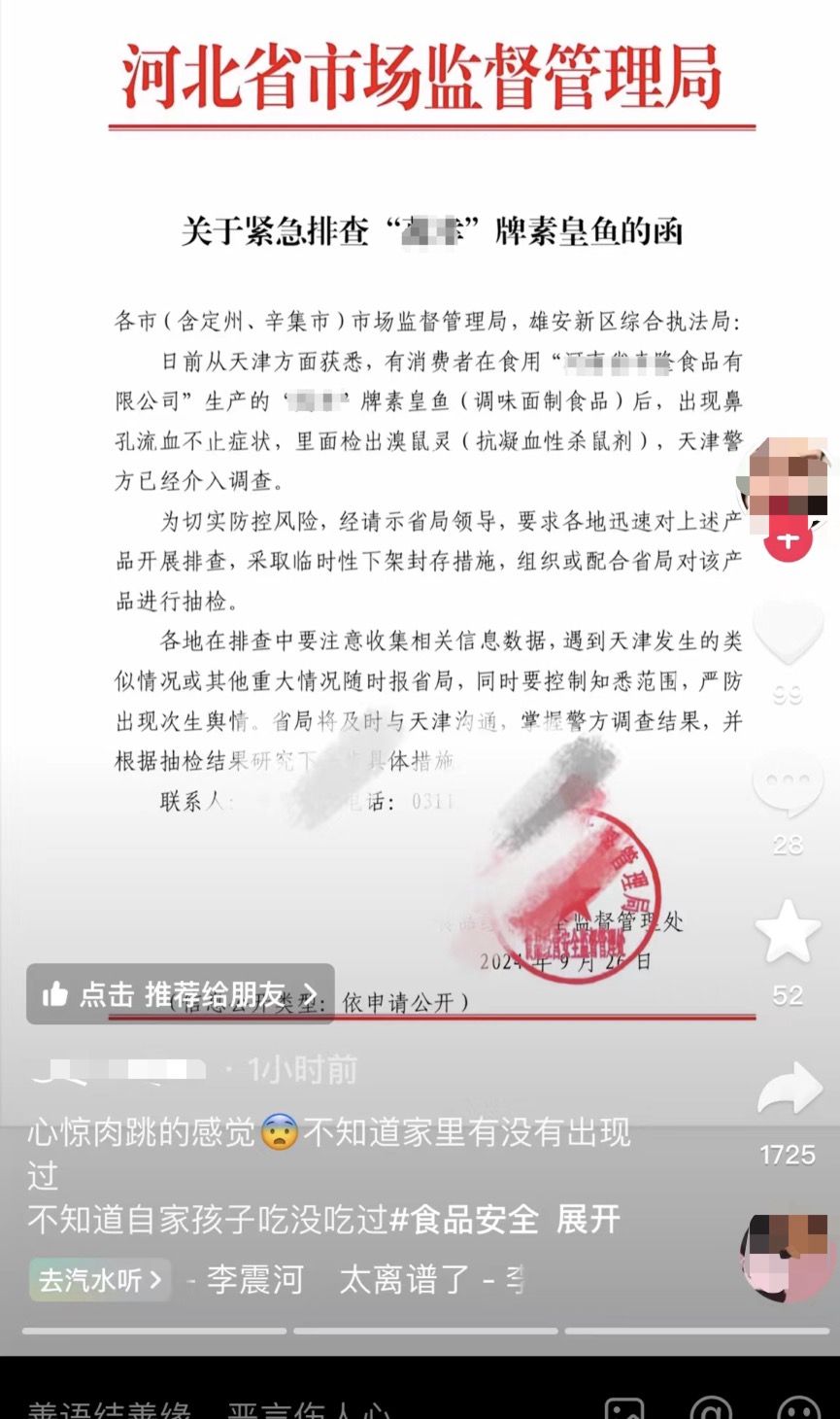 9月26日晚,一份印有河北省市场监督管理局公章的红头文件在一个社交平台上流传。该文件显示,主题为“关于XXX品牌素食鱼紧急排放的函”。该函的正文显示,从天津获悉,消费者在XXX食品公司生产的XXX品牌素食鱼(调味面制食品)后,不仅出现了鼻孔出血的症状,还检测到了溴鼠灵(抗凝血杀鼠剂)。文件要求各地迅速对上述产品进行排查,采取临时下架保存措施,组织或配合省局对产品进行抽检。