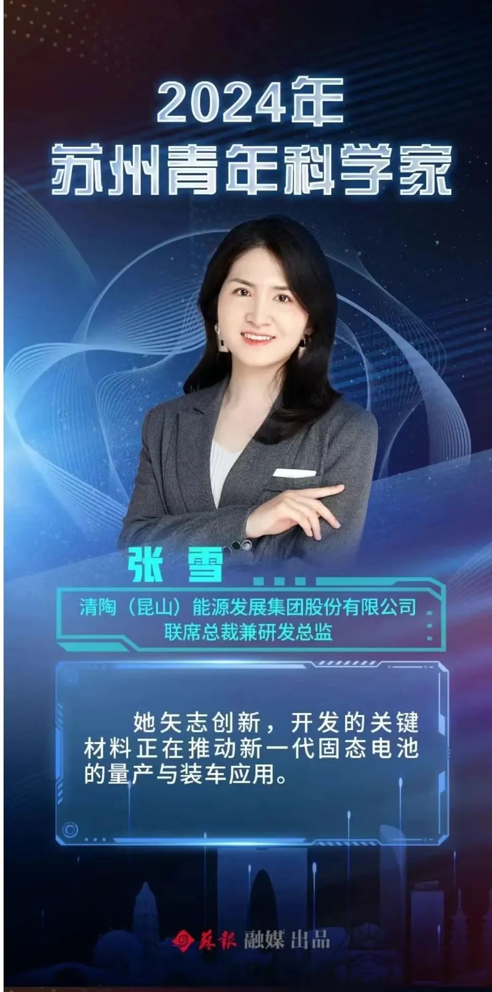 2022年2月,张雪引进至清陶,担任R&D总监,并于2023年7月担任联席总裁。到目前为止,我已经从事锂电池领域的研发工作了9年多,共发表了23篇SCI论文,申请了68项锂电池相关专利,其中12项授权,6项PCT国际专利,研究成果丰硕。在固态电池关键材料和系统平台的研发中,多年来一直深入培育,始终保持着科技创新的热情。在攻读博士学位期间,张雪在聚合物基复合固态电解质方向取得了许多原创性成果,受到了学术界和工业界的高度关注。来到苏联后,带领团队不断突破固态锂电池的关键材料、新的电化学系统和产品开发,为公司新一代产品的升级做出了重要贡献。与此同时,她率先组建的苏州市创新联合体,将上下游产业链结合起来,为新能源科技产业集群升级和产业品牌化发展做出了贡献。