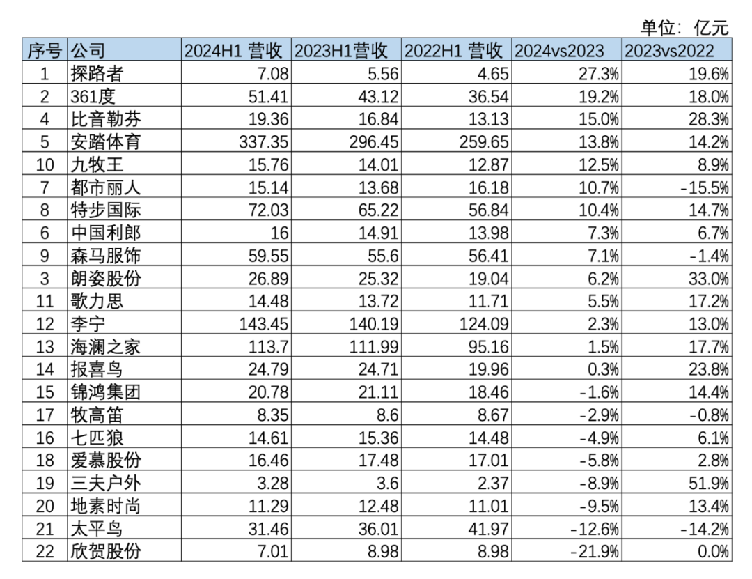 根据2024年中期报告的数据,探路者、361度、比音勒芬、安踏体育、特步国际等公司连续两年保持双位数销售增长,但2024年上半年部分公司业绩增速明显放缓。比如2023年上半年朗姿股份、歌力思、李宁、蓝海之家、报喜鸟等品牌增速较快,2024年上半年增速跌至个位。只是略有增长,增长势头大幅放缓。