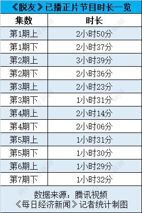 据《每日经济新闻》记者统计,《脱友》和《单口季》已经播出了整部电影的时长,发现截至9月26日18时许,《脱友》12集节目总时长达26小时,其中7集节目时长超过2小时,最长的节目为3小时39分钟。同样,12集节目《单口季》的总时长也高达22.4小时。