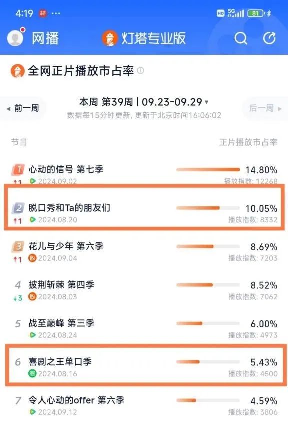 经过一年多的蛰伏,“脱友”和“单口季”这两个脱口秀“名场面”不断更新,引起了很多关注和讨论。灯塔专业版显示,截至目前,综艺节目最新一周,《脱友》和《单口季》在全网播出的市场份额分别为10.05%和5.43%,分别排名第二和第六。