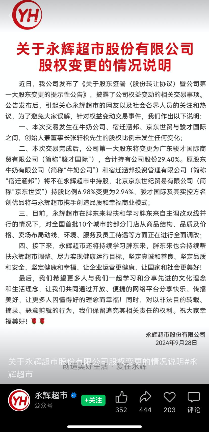 9月28日,永辉超市微信视频号发布了《永辉超市股份有限公司股东变更情况说明》,该公司以63亿元的名优产品入股永辉。声明指出,创始人兼董事长张轩松的股权比例没有变化。