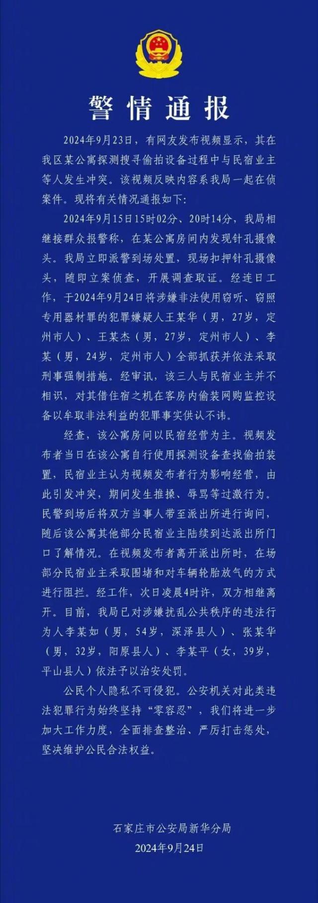 一位博主透露,在石家庄市新华区的几家民宿中发现了多个偷拍摄像头,并记录并上传了发现、摘除的全过程。