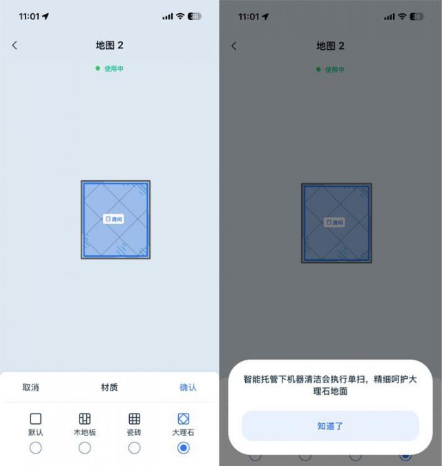 值得注意的是,地宝之所以能够根据不同的路面来清理顽固污渍,是因为地宝 X8 PRO 有丰富的路面专属清洁策略,可以根据不同家庭的个性进行清洁,可以在科沃斯进行。 APP 在中间,设置路面材料。例如,选择大理石地面之后,可以 AI 在智能托管的托管模式下,机器人会对路面进行单扫,清洗时会将上升滚筒放入大理石表面,避免水渍污染,影响路面美观。