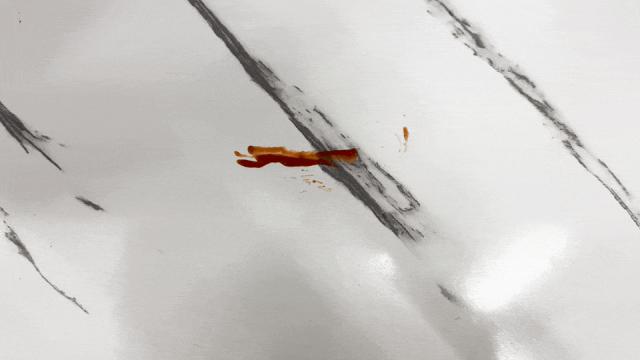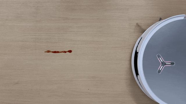 从测试动图可以看出,番茄酱分别涂在地板和瓷砖上,地宝 X8 PRO 可以一次性清理干净。而不是像普通的扫地机器人一样,用拖把反复转圈清洗,属于用污染的拖把反复用脏拖把清洗同一个区域,效果不理想。相比之下,地宝 X8 PRO 不但提高了顽固污渍的清洗效率,而且在清洗时也不会污染周围区域。