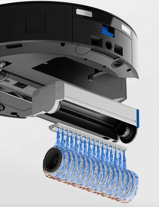 不但如此,地宝 X8 PRO 清水箱和污水箱集成在机身上,并配有 16 一个清水喷头可以立即给滚刷补充水分。同时,用自研恒压刮刀刮擦滚刷,挤出废水,实时回收。当滚刷达到一定的污水水平时,洗车还会回到基站进行大量清洗,以确保整个房子清洗时滚刷的清洁度。