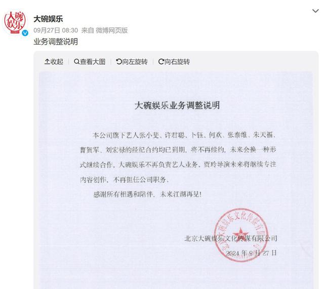 文件表明,除了不担任公司职务外,贾玲还将专注于内容创作,贾玲创立的大碗娱乐业务也进行了调整,不再继续负责艺人业务。