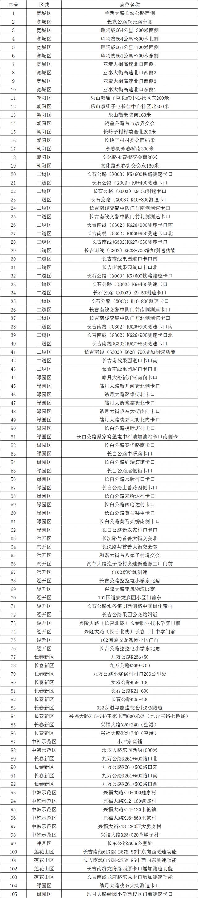 长春市公安局交警支队为有效改善公路交通环境,规范国省干道、郊区、农村道路交通秩序,如下。 105 处点启用交通违法抓拍设备,计划处理车辆超速、不按规定停车、不按规定使用安全带、开车时拨打接听手持电话、按线行驶、闯红灯、逆向行驶、开车时吸烟等交通违法行为。现在有违法抓拍的条件。目前正在向社会公布抓拍点。