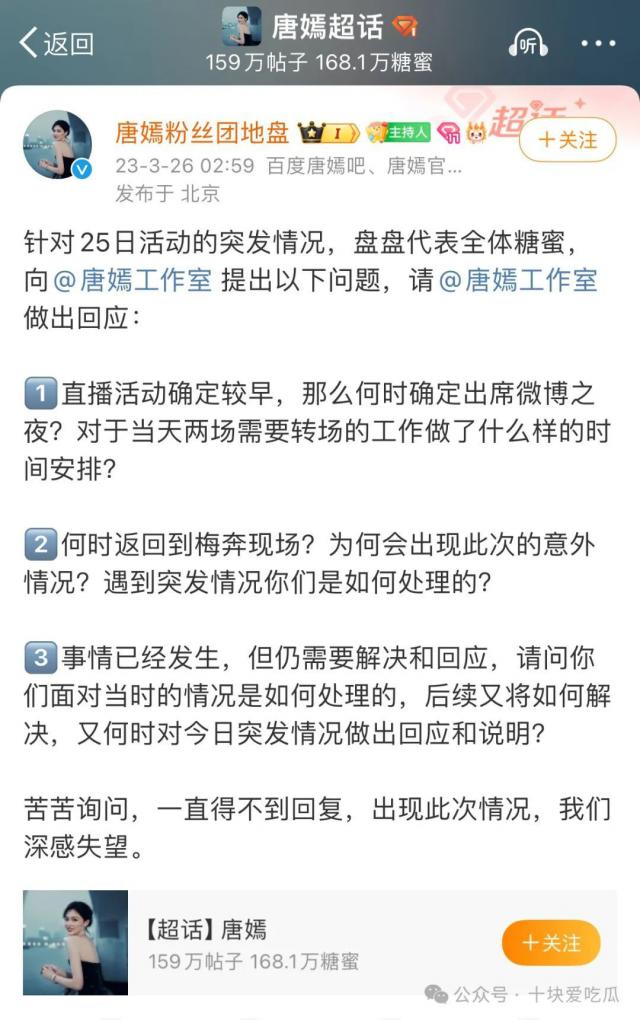 经过这件事,唐嫣更是被“嘲讽”了,最大的后援会也在微博上发了一条消息。 @唐嫣工作室,提出灵魂三连问,这件事一度闹上热搜。
