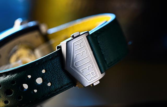 最后,在佩戴方面,手表提供了一条绿色穿孔表带,与整体配色一致。优雅的绿色源于英国绅士的审美风格。表带与钛金属折叠表扣相结合固定,饰有“ Heuer "logo,坚固可靠。