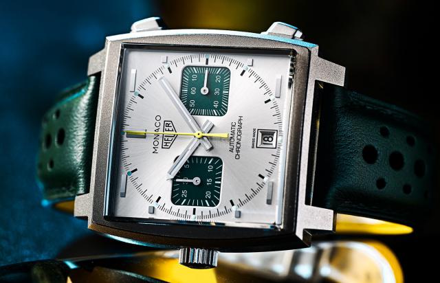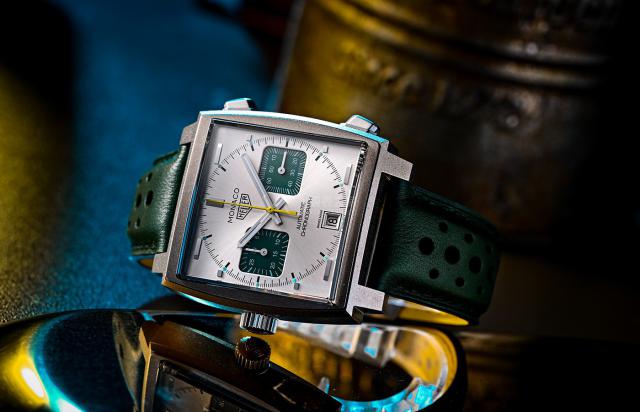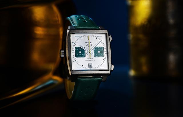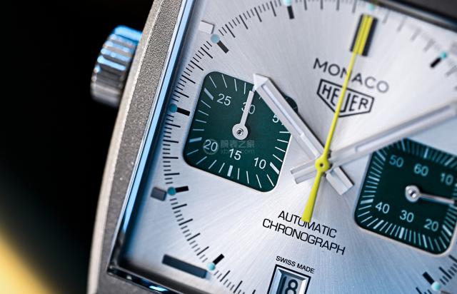 [ 手表之家 影像时计 ] 在跑车记时领域,泰格豪雅(TAG Heuer)摩纳哥系列计时码表具有绝对的话语权。自 1970 史蒂夫戴着摩纳哥手表。 · 麦昆(Steve McQueen)电影《极速狂飙》手腕上出现在电影中。(Le Mans)其中,独特的方形计时表,成为无数骑手的首选。从去年开始,泰格豪雅推出了摩纳哥系列特别版手表,结合跑车领域的国家代表色。自去年法国“速蓝”版以来,该品牌带来了全新的英国“速绿”模式。如何设计新产品?详情请参见下面的细节实拍美图:(手表型号:CAW218E.FC6565)(本文所有照片均由手表之家拍摄,未经允许不得使用,违者必究)