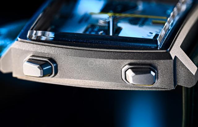 新款摩纳哥“竟速绿”计时码表在选材方面得到了应用。 2 级钛金属材料制成方形表壳,喷砂工艺后的饰面呈现出暗沉的磨砂质感,几何外壳设计也带来强烈的力量感。开始玩,39 毫米钛轻便舒适,尺寸适中,适合大多数表友佩戴。