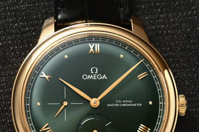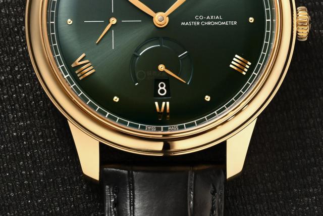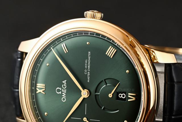 整个墨绿色的表盘简洁而不简单,这也是欧米茄碟飞系列的一贯设计。表盘 6 点位设有 270 ° 动力储存显示窗口,让您随时掌握机芯的运转状态;下面是日历显示窗口,满足您每天佩戴的各种需要。