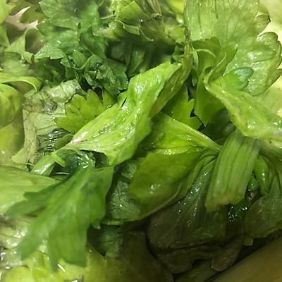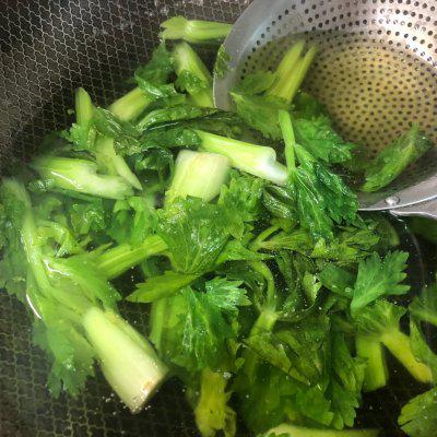 5、加入西芹茎干焯水 1 叶焯30秒,分钟。