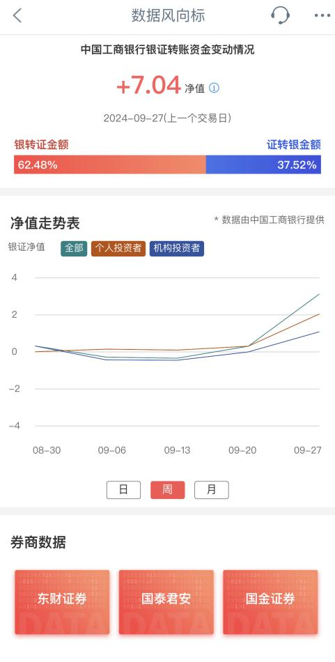 工商银行移动App显示,9月27日(前一交易日)银证转账指数上升至7.04,明显高于前几个交易日。九月二十三日至二十六日,银证转账指数为0.66、2.15、1.4、4.4。九月二十七日,个人投资者银证转账指数为5.2,机构投资者银证转账指数为1.84。九月二十三日至二十七日,银证转账指数为3.13,较前几周有明显增长。