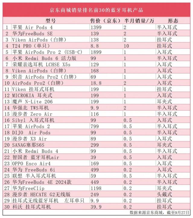 随着蓝牙耳机市场的发展到一定阶段,技术竞争和价格竞争越来越激烈。同时,为了获得更多的市场,终端厂商也在加快规划电子商务等在线渠道。JD.COM商城作为国内主流电商平台,也可以作为蓝牙耳机销量统计的可靠平台。所以电子发烧友网统计截至目前 9 月 27 JD.COM商城蓝牙耳机畅销榜,从而观察蓝牙耳机在不同销售排名、不同产品形式的市场情况。