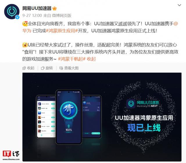 IT 世家 9 月 30 日消息,网易 UU 加速器官方于 9 月 27 日本宣布,完成鸿蒙原生应用开发,并正式开发,上线 HarmonyOS NEXT 应用市场。这位官员表示,将继续在三大操作系统中并驾齐驱,为用户提供游戏加速服务。