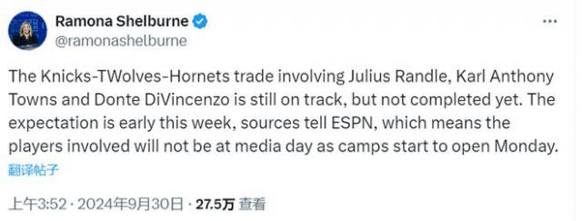 北京时间 9 月 30 日,据 ESPN 记者 Ramona Shelburne 报道称,唐斯的三方交易仍在进行中,预计将于本周初正式完成。这意味着所有参与交易的球员都不能参加自己球队的媒体日活动和新赛季的第一天训练营。