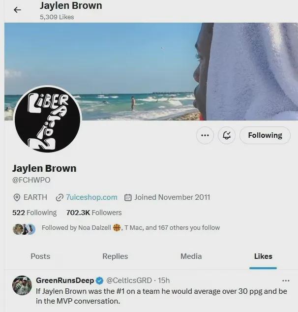 今年 3 月份杰伦曾经点赞过一篇文章,内容写道:“如果我家的杰伦是绿凯的招牌,他会把平均能量放在场上。 30 分,并进入 MVP 讨论团队。"